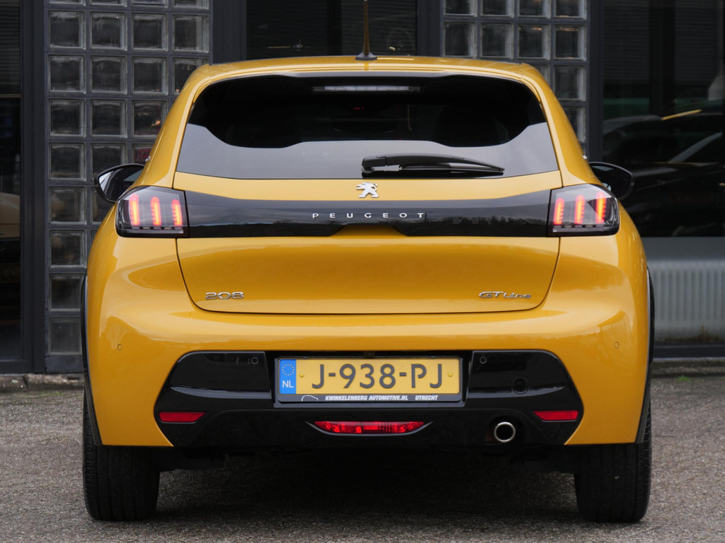 Deze Peugeot 208 valt direct op. Het sportieve design van de 'GT-Line' kenmerkt zich door de Full LED koplampen met accentverlichting, fraaie 17inch grote lichtmetalen velgen, een specifieke GT-Line grille, hoogglans zwart exterieuraccenten zoals om de wielkasten, extra getinte ramen achter en hoogglans zwarte spiegelkappen.